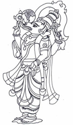 So, all the yajnas, or sacrificial ceremonies, were said to be latent in the pores of Varaha, the causal boar. The sacrificial grass was his hair, the ghee pot his eyes, the soma his semen, and the yajna priests his legs. All the yajnas, lasting from one day to one thousand years, were his joints and the different kinds of yajna were his dhatus, or bodily elements. Being the embodiment of yajna, Varaha also manifests as all the mantras, deities and material offerings utilized in the yajna. Thus all the rites of yajna are identical with Varaha, the descent of cosmic consciousness to the earthly dimension in the form of the causal boar.