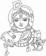 The word Krishna means dark, shyam, indicating supreme consciousness, in the sense that it remains unseen and unknown by those who are blinded by material attachments. Krishna is depicted as blue, neela, in colour and dressed in yellow garments. Blue is associated with the sky and yellow with earth. Hence the blue form of Krishna clothed in yellow suggests the descent of infinite consciousness to earth to play in his finite form. In his life Krishna shows that although the infinite being seems to be limited by human form, it is ever free and unconditioned. The pure self, being subtler than matter, is neither affected nor bound by the body and mind.